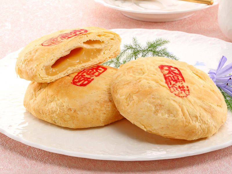 A Suncake, or Taiyang Bing, is a popular Taiwanese traditional dessert originally from the city of Taichung, Taiwan. The typical fillings consist of maltose (condensed malt sugar), and they are usually sold in the special gift boxes as souvenirs for visitors. Some famous Suncake pastry shops always have long lines of people waiting to buy a box of Suncakes. Suncakes are round in Taiwan, and they may vary in size. They are characterized by flaky crusts. Most people eat them with Chinese tea, and some people dissolve them in hot water to make a porridge-like dessert. You can get the Suncake from any souvenirs shop or even in the food courts surround Taiwan.